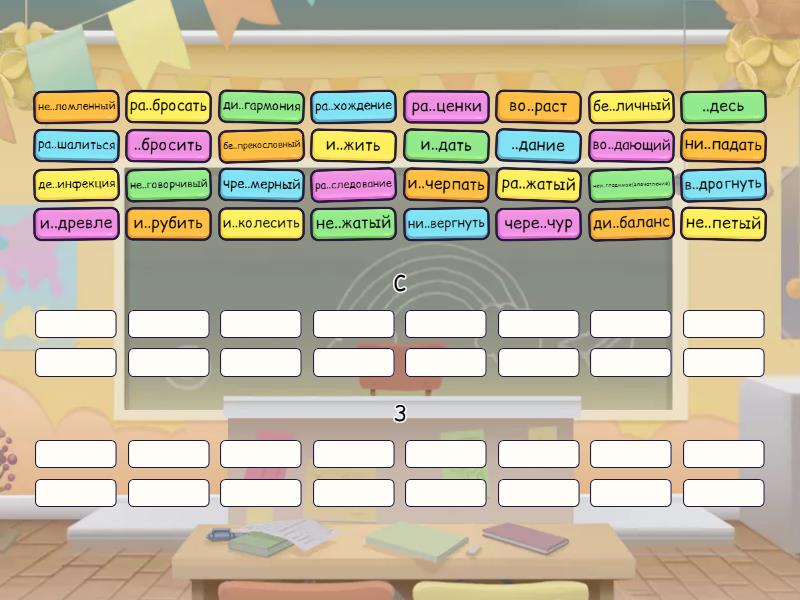 С: и..колесить, ра..ценки, ра..следование, не..ломленный, ни..падать, и..черпать, не..жатый, ди..гармония, не..петый, чере..чур, ..бросить, ра..хождение, ди..баланс, бе..прекословный, не..говорчивый, ра..шалиться, З: бе..личный, ни..вергнуть, в..дрогнуть, ра..бросать, ..дание, де..инфекция, чре..мерный, ..десь, во..раст, и..жить, и..дать, во..дающий, неи..гладимое(впечатление), и..рубить, ра..жатый, и..древле,
