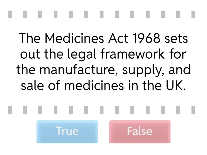 True: The Medicines Act 1968 sets out the legal framework for the manufacture, supply, and sale of medicines in the UK., The Human Medicines Regulations 2012 updated and consolidated the requirements of the Medicines Act 1968., The General Pharmaceutical Council (GPhC) regulates pharmacy professionals and ensures pharmacies meet legal standards., MHRA (Medicines and Healthcare products Regulatory Agency) monitors the safety of medicines and medical devices in the UK., Good Manufacturing Practice (GMP) ensures that products are consistently produced to quality standards., Cleanliness, correct labelling, and controlled environments are essential parts of safe manufacturing., All equipment must be calibrated and maintained to prevent errors in manufacturing., Staff training and competency checks are part of maintaining safe manufacturing practices., Standard Operating Procedures (SOPs) provide step-by-step instructions to ensure consistent and safe practice., Any errors in manufacturing or dispensing must be recorded and investigated., Effective incident management includes reporting, investigation, corrective action, and learning to prevent recurrence., False: Following legislation is optional if a pharmacy believes its own procedures are safe., Risk assessments are not required if the product being manufactured is commonly used., Deviations from SOPs should always be ignored if they seem minor., Near misses do not need reporting because no actual harm occurred.,