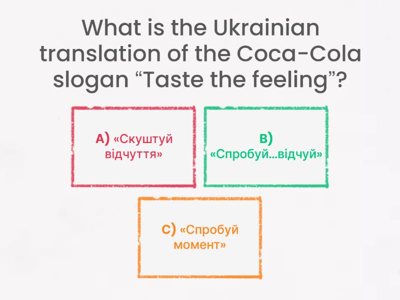 1) What is the Ukrainian translation of the Coca-Cola slogan “Taste the feeling”? a) А) «Скуштуй відчуття» b) В) «Спробуй...відчуй» c) С) «Спробуй момент» 2) Which translation best captures the meaning of Apple's slogan "Think different"? a) A) «Думай інакше» b) B) «Мисли інакше» c) C) «Думай по-іншому» 3) Red Bull's famous slogan "Red Bull gives you wings" translates as: a) A) «Смак, що заряджає енергією»«Red Bull дає тобі сили» b) B) «Red Bull надихає» c) C) «Red Bull надає крила» 4) Which translation most accurately conveys the meaning of BMW's slogan "The ultimate driving machine"? a) A) «Машина для водіння» b) B) «Найкращий автомобіль для водія»  c) C) «Автомобіль для подорожей» 5) The Pringles slogan “Once you pop, you can’t stop” is often adapted in Ukraine as: a) A) «Відкрив пачку – і не зупинишся» b) B) «Скуштував – не відірвешся» c) C) «Раз відкрив – і все твоє» 6) Airbnb's slogan “Belong anywhere” is translated into Ukrainian as: a) A) «Будь де завгодно» b) B) «Знайди своє місце» c) C) «Почувайся як удома всюди» 7) How is the Subway slogan “Eat fresh” translated? a) A) «Смакуй свіжість» b) B) «Їжа завжди свіжа» c) C) «Обирай свіже» 8) Intel's slogan “Sponsors of tomorrow” is known in Ukrainian as: a) A) «Творці завтрашнього дня» b) B) «Спонсори завтрашніх рішень» c) C) «Інвестуємо у майбутнє» 9) Which translation best captures the meaning of the IKEA slogan “The wonderful everyday”? a) A) «Кожен день сповнений чудес» b) B) «Чудовий кожен день» c) C) «Дива щодня» 10) Which translation best conveys the idea of ​​the L’Oréal slogan “Because you’re worth it”? a) A) «Тому що ти цінна» b) B) «Тому що ти дорога» c) C) «Адже ти цього варта»
