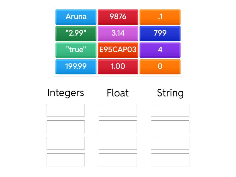 Integers: 4, 799, 9876, 0, Float: 1.00, .1, 199.99, 3.14, String: "true", Aruna, "2.99", E95CAP03,