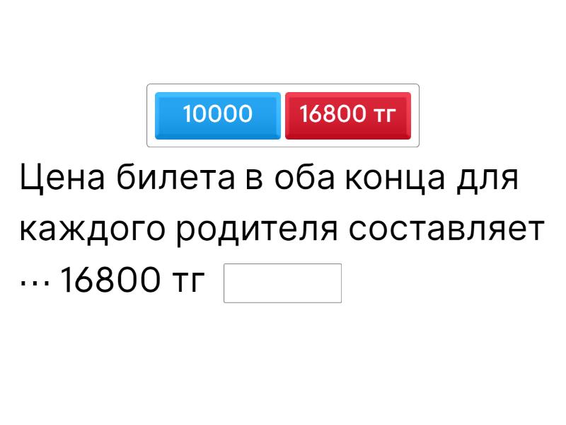 Цена билета в оба конца для каждого родителя составляет … 16800 тг ____ На банковской карте было … тенге. ____ Стоимость питания для одного человека в сутки равна … тенге. ____ В гостинице предложили три варианта номеров: «люкс» — …, «комфорт» — …, «стандарт» — …. ____ Родителям нужно рассмотреть, хватит ли остатка денег на … и … на 5 суток. ____