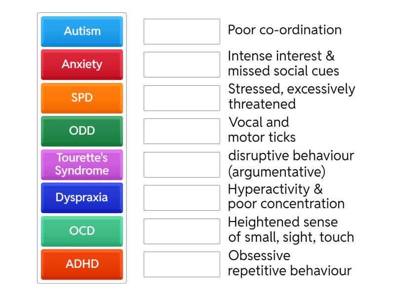 ADHD - Hyperactivity & poor concentration, ODD - disruptive behaviour (argumentative), Autism - Intense interest & missed social cues, OCD - Obsessive repetitive behaviour, Tourette's Syndrome - Vocal and motor ticks, Dyspraxia - Poor co-ordination, Anxiety - Stressed, excessively threatened, SPD - Heightened sense of small, sight, touch,
