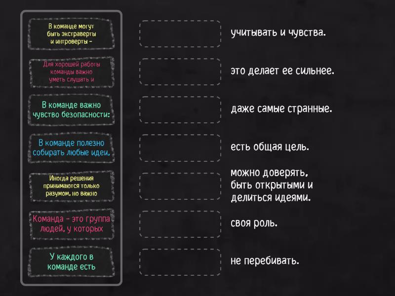 Команда - это группа людей, у которых - есть общая цель., В команде важно чувство безопасности: - можно доверять, быть открытыми и делиться идеями., У каждого в команде есть - своя роль. , Для хорошей работы команды важно уметь слушать и - не перебивать., В команде могут быть экстраверты и интроверты - - это делает ее сильнее., Иногда решения принимаются только разумом, но важно - учитывать и чувства., В команде полезно собирать любые идеи, - даже самые странные.,