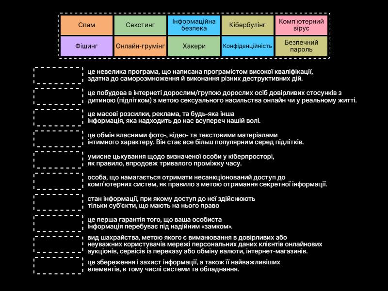 Інформаційна безпека - це збереження і захист інформації, а також її найважливіших елементів, в тому числі системи та обладнання., Конфіденційність - стан інформації, при якому доступ до неї здійснюють тільки суб'єкти, що мають на нього право, Безпечний пароль - це перша гарантія того, що ваша особиста інформація перебуває під надійним «замком»., Хакери - особа, що намагається отримати несанкціонований доступ до комп'ютерних систем, як правило з метою отримання секретної інформації. , Комп'ютерний вірус - це невелика програма, що написана програмістом високої кваліфікації, здатна до саморозмноження й виконання різних деструктивних дій., Спам - це масові розсилки, реклама, та будь-яка інша інформація, яка надходить до нас всупереч нашій волі., Кібербулінг - умисне цькування щодо визначеної особи у кіберпросторі, як правило, впродовж тривалого проміжку часу., Фішинг - вид шахрайства, метою якого є виманювання в довірливих або неуважних користувачів мережі персональних даних клієнтів онлайнових аукціонів, сервісів із переказу або обміну валюти, інтернет-магазинів., Секстинг - це обмін власними фото-, відео- та текстовими матеріалами інтимного характеру. Він стає все більш популярним серед підлітків., Онлайн-грумінг - це побудова в інтернеті дорослим/групою дорослих осіб довірливих стосунків з дитиною (підлітком) з метою сексуального насильства онлайн чи у реальному житті.,