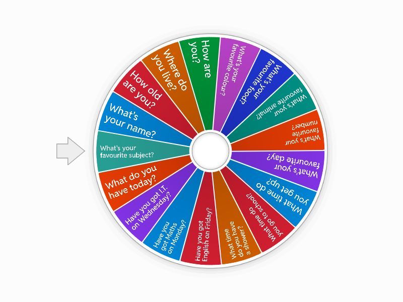 1) What's your name? 2) How old are you? 3) Where do you live? 4) How are you? 5) What's your favourite colour? 6) What's your favourite food? 7) What's your favourite animal? 8) What's your favourite number? 9) What's your favourite day? 10) What time do you get up? 11) What time do you go to school? 12) What time do you have a shower? 13) Have you got English on Friday? 14) Have you got Maths on Monday? 15) Have you got I.T. on Wednesday? 16) What do you have today? 17) What's your favourite subject?