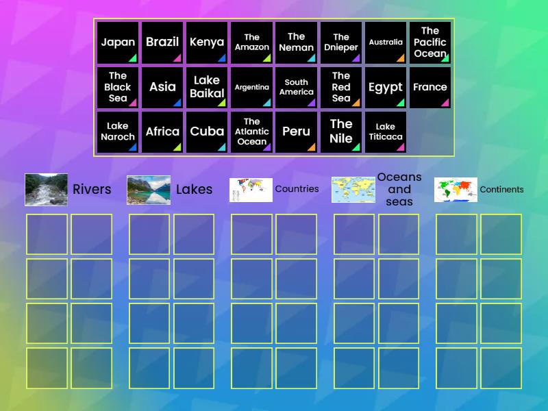 Rivers: The Amazon, The Nile, The Dnieper, The Neman, Lakes: Lake Titicaca, Lake Baikal, Lake Naroch, Countries: Cuba, Egypt, Japan, Brazil, France, Peru, Argentina, Kenya, Oceans and seas: The Pacific Ocean, The Atlantic Ocean, The Red Sea, The Black Sea, Continents : Asia, South America, Africa, Australia,