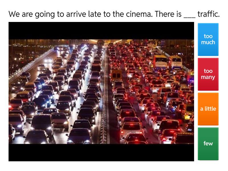 1) We are going to arrive late to the cinema. There is ___ traffic. a) too much b) too many c) a little d) few 2) The documentary has ___ ideas about how to earn money on line. a) a few b) a little c) much d) any 3) I can't go out tonight. I want to save _____ money for a new mobile phone. a) little b) some c) many d) few 4) There are___ students from my school in this show. a) much b) a little c) many d) lots of 5) The doctor in films says we should drink _______ water during the day, especially in summer. a) any b) many c) a lot of d) little 6) The character of the movie has___ real friends. I think he should be more sociable and friendly. a) few b) a little c) many d) any 7) I want to go to the Loolapalooza! They told me there are ___ tickets left. I have to buy them now! a) many b) a few c) a little d) a lot of 8) My dad is selling his Coldplay tickets and there are____ people interested in it. It is great!!! a) little b) much c) lots of d) few 9) I can't go to the theatre with my little sister. I really don't have_____ patience to be with children. a) many b) any c) a lot of d) a few 10) I have watched this 3D film___ times. I really really love it! a) much b) few c) little d) many 11) You can bring an action film for the movie night tonight. I don't have____ a) some b) any c) a few d) a lot of 12) This series is not very modern but it has ____ great special effects. a) few b) any c) lots of d) a little