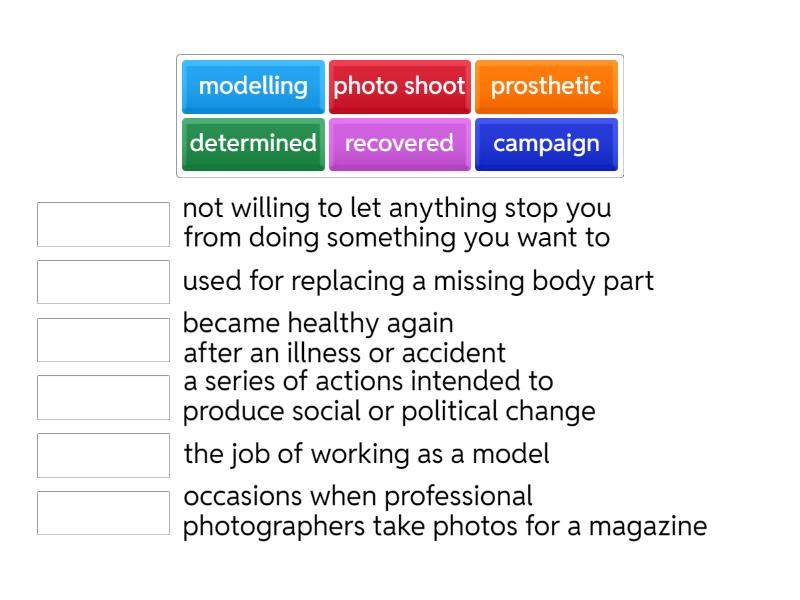 modelling - the job of working as a model, photo shoot - occasions when professional photographers take photos for a magazine, determined - not willing to let anything stop you from doing something you want to, recovered - became healthy again after an illness or accident, prosthetic - used for replacing a missing body part, campaign - a series of actions intended to produce social or political change,