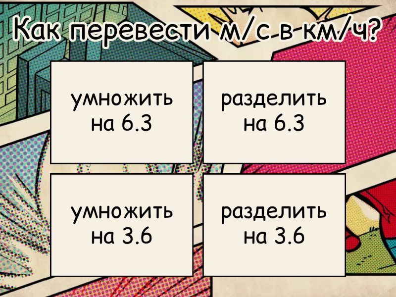 1) Как перевести м/с в км/ч? a) умножить на 6.3 b) разделить на 6.3 c) умножить на 3.6 d) разделить на 3.6 2) Как называется воображаемая линия, по которой движется тело? a) Путь b) Перемещение c) Траектория d) Вектор 3) Тело, относительно которого рассматривается движение a) Тело счёта b) Стартовое тело c) Тело отсчёта d) Изначальное тело 4) Как найти ускорение? a) F/a b) F*m c) F/m d) m/F 5) Какой факт о Исааке Ньютоне лишний? a) Был хранителем монетного двора b) Появился на свет преждевременно c) Был женат лишь раз в жизни d) Был посвящён в рыцарское достоинство 6) Что такое путь? a) Линия движения тела b) Длина перемещения c) Длина траектории d) Вектор, соединяющий начальную и конечную точки 7) Величина, не имеющая направления a) Перемещение b) Векторная c) Скалярная d) Ускорение 8) В чём измеряется ускорение? a) с²/м b) м/с c) м/с² d) с/м 9) Кинематика - это раздел... a) Математики b) Селекции c) Механики d) Движения 10) а=F/m <- какой это закон? a) Закон всемирного тяготения b) Третий закон Ньютона c) Второй закон Ньютона d) Четвёртый закон Ньютона