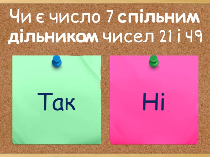1) Чи є число 7 спільним дільником чисел 21 і 49 a) Так b) Ні 2) Чи є число 15 спільним дільником чисел 50 і 30 a) Так b) Ні 3) Вкажіть найбільший спільний дільник чисел 48 і 24  a) 2 b) 24 c) 6 d) 8 4) Вкажіть найбільший спільний дільник чисел 17 і 18  a) 2 b) 1 c) 6 d) 8 5) Вкажіть найбільший спільний дільник чисел 36 і 24 a) 3 b) 6 c) 12 d) 18 6) Виберіть пару чисел , що є взаємно простими числами a) 4 і 8 b) 3 і 9 c) 7 і 12 d) 15 і 25 7) Оберіть числа, які дільться на 2 a) 262626 b) 37577 c) 5980 d) 38942 8) Оберіть числа, які діляться на 5 a) 248700 b) 2145 c) 2369 d) 4582 9) Оберіть числа, які діляться на 9 a) 36900 b) 810036 c) 4653 d) 4482