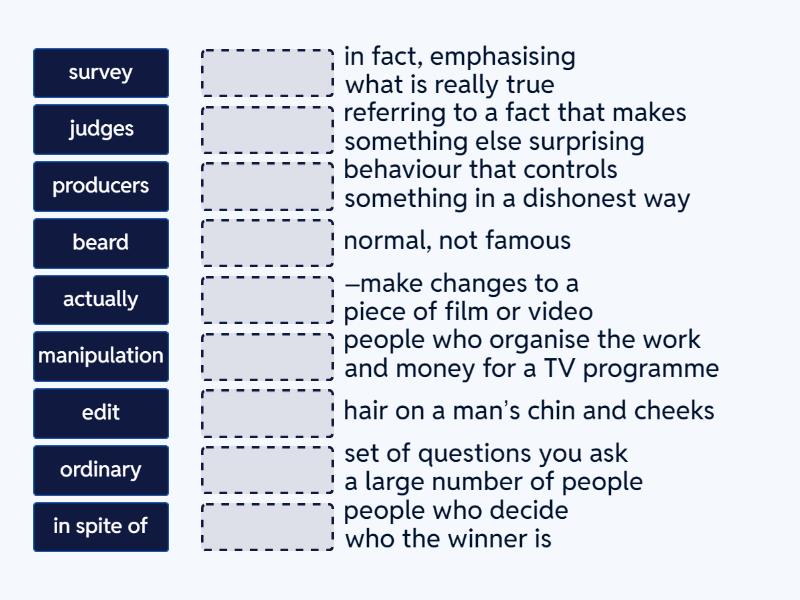 beard - hair on a man’s chin and cheeks, actually - in fact, emphasising what is really true, ordinary - normal, not famous, edit - –make changes to a piece of film or video, in spite of - referring to a fact that makes something else surprising, survey - set of questions you ask a large number of people, producers - people who organise the work and money for a TV programme, judges - people who decide who the winner is, manipulation - behaviour that controls something in a dishonest way,