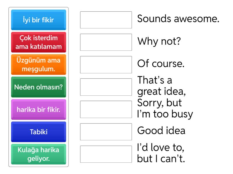 Orda olacağım. - I will be there., Üzgünüm ama meşgulum. - Sorry, but I’m too busy, Çok isterim - I’d love to, Kulağa harika geliyor. - Sounds awesome., Kabul edemem. - I can't accept., Bunu reddedemem - I can’t refuse it., İyi bir fikir - Good idea, Tabiki - Of course., Sana katılamıyorum - l can’t join you, Çok isterdim ama katılamam - I’d love to, but I can’t., Teşekkür ederim. Tokum. - thanks. I’m full., Neden olmasın? - Why not?, harika bir fikir. - That’s a great idea,,