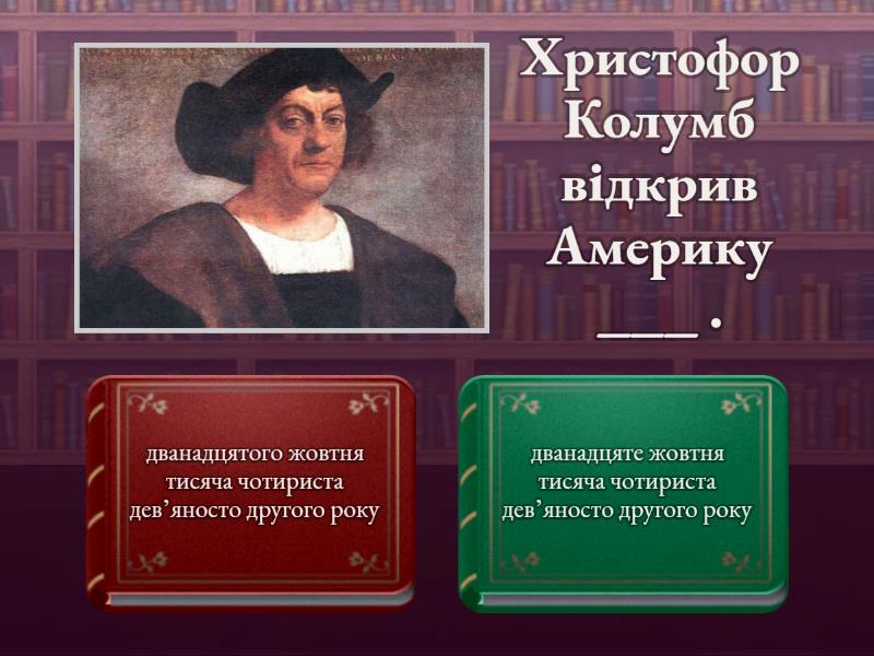 1) Христофор Колумб відкрив Америку ___ . a) дванадцятого жовтня тисяча чотириста дев’яносто другого року b) дванадцяте жовтня тисяча чотириста дев’яносто другого року 2) Ніл Армстронг став першою людиною, яка ступила на поверхню Місяця ____ . a) двадцяте липня тисяча дев’ятсот шістдесят дев’ятий рік b) двадцятого липня тисяча дев’ятсот шістдесят дев’ятого року 3) Україна проголосила незалежність ___ . a) двадцять четверте серпня тисяча дев’ятсот дев’яносто перший рік b) двадцять четвертого серпня тисяча дев’ятсот дев’яносто першого року 4) Взяття Бастилії відбулося ___ . a) у липні тисяча сімсот вісімдесят дев’ятого року b) липня тисяча сімсот вісімдесят дев’ятий рік 5) Найбільша техногенна катастрофа ХХ століття сталася на Чорнобильській АЕС ___ . a) у квітні тисяча дев’ятсот вісімдесят шостим роком b) у квітні тисяча дев’ятсот вісімдесят шостого року 6) Різдво святкують ___ . a) у грудні або в січні b) груднем або січнем c) грудня або січня d) грудню або січню 7) Карнавал у Ріо-де-Жанейро зазвичай відбувається ___ . a) лютого b) у лютому c) лютому d) лютим 8) Великдень найчастіше святкують ___ . a) квітня або травня b) квітнем або травнем c) квітню або травню d) у квітні або травні 9) Джинси винайшли ___ . a) у дев’ятнадцятому столітті b) дев’ятнадцятим століттям c) дев’ятнадцяте століття d) дев’ятнадцятого століття 10) Київський університет був заснований ___ . a) тисяча вісімсот тридцять четвертим роком b) у тисяча вісімсот тридцять четвертому році c) тисяча вісімсот тридцять четвертого року d) тисяча вісімсот тридцять четвертий рік 11) Гутенберг винайшов друкарський верстат ___ . a) п’ятнадцяте століття b) п’ятнадцятим століттям c) у п’ятнадцятому столітті d) п’ятнадцятого століття 12) ___ впала Берлінська стіна. a) У листопаді тисяча дев'ятсот вісімдесят дев'ятого року b) листопад тисяча дев'ятсот вісімдесят дев'ятий рік c) листопада тисяча дев'ятсот вісімдесят дев'ятого року d) листопадом тисяча дев'ятсот вісімдесят дев'ятий рік 13) Олімпійські ігри вперше відбулися у Греції ___ . a) у восьмому столітті до н.е. b) восьмого століття до н.е. c) восьме століття до н.е. d) восьмим століттям до н.е. 14) Перші перуки з'явилися у стародавньому Єгипті ___ . a) третє тисячоліття до н.е. b) у третьому тисячолітті до н.е. c) третьому тисячолітті до н.е. d) третього тисячоліття до н.е.