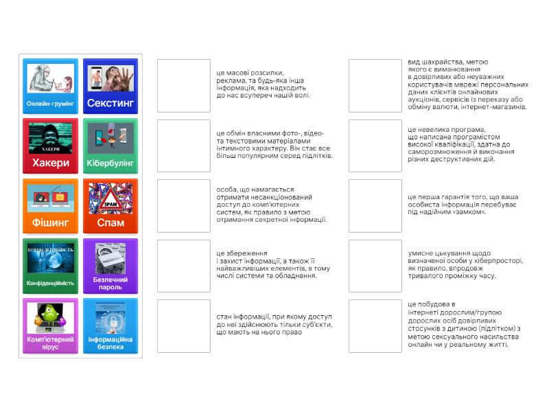 Фішинг - вид шахрайства, метою якого є виманювання в довірливих або неуважних користувачів мережі персональних даних клієнтів онлайнових аукціонів, сервісів із переказу або обміну валюти, інтернет-магазинів., Хакери - особа, що намагається отримати несанкціонований доступ до комп'ютерних систем, як правило з метою отримання секретної інформації. , Кібербулінг - умисне цькування щодо визначеної особи у кіберпросторі, як правило, впродовж тривалого проміжку часу., Спам - це масові розсилки, реклама, та будь-яка інша інформація, яка надходить до нас всупереч нашій волі., Комп'ютерний вірус - це невелика програма, що написана програмістом високої кваліфікації, здатна до саморозмноження й виконання різних деструктивних дій., Секстинг - це обмін власними фото-, відео- та текстовими матеріалами інтимного характеру. Він стає все більш популярним серед підлітків., Онлайн-грумінг - це побудова в інтернеті дорослим/групою дорослих осіб довірливих стосунків з дитиною (підлітком) з метою сексуального насильства онлайн чи у реальному житті., Конфіденційність - стан інформації, при якому доступ до неї здійснюють тільки суб'єкти, що мають на нього право, Безпечний пароль - це перша гарантія того, що ваша особиста інформація перебуває під надійним «замком»., Інформаційна безпека - це збереження і захист інформації, а також її найважливіших елементів, в тому числі системи та обладнання.,