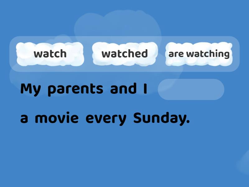 My parents and I ____ a movie every Sunday. Alice and Ninnie ____ dinner together last night. Ricky and Jaylen ____ basketball after school every day. Fei and Debby ____ their grandma tomorrow afternoon. My friends and I ____ English at the library last weekend. They ____ shopping at the mall every Saturday. Kevin and his brother ____ their room yesterday. We ____ to school every morning. Matthew and his cousin ____ the piano last Friday. My classmates and I ____ singing for the school play now. The boys ____ TV in the living room last night. My sisters ____ our mother cook every evening. My friends ____ in the pool last summer. The children ____ the zoo last Sunday. The teachers ____ our homework yesterday afternoon. We ____ lunch at McDonald’s tomorrow. The girls ____ math together last week. My brothers ____ computer games every day. The students ____ their hands before lunch yesterday. Alice and her friends ____ their bikes to school this morning.