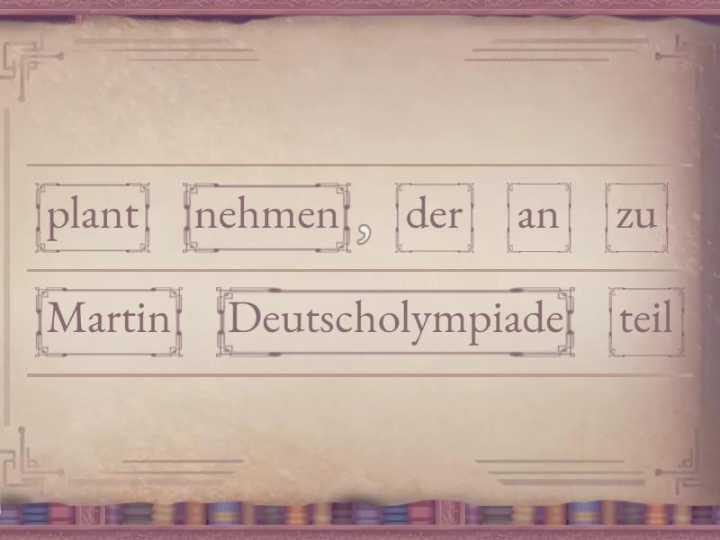Martin plant, an der Deutscholympiade teil zu nehmen, Martin versucht, alle Aufgaben richtig zu lösen, Martin verspricht, Deutsch zu lernen, Martin beschließt, einen neuen Roman zu lesen, Martin verbietet seinem Bruder, an seinem Computer zu spielen, Martin empfiehlt seiner Freundin, mehr an der Grammatik zu arbeiten, Martin bittet seinen Freund, bei den Hausaufgaben zu helfen, Martin hofft, in den Ferien nach Deutschland zu fliegen, Martin vergisst, seine Mutter an zu rufen, Martin erlaubt dem Kind, das Fenster zu öffnen.,