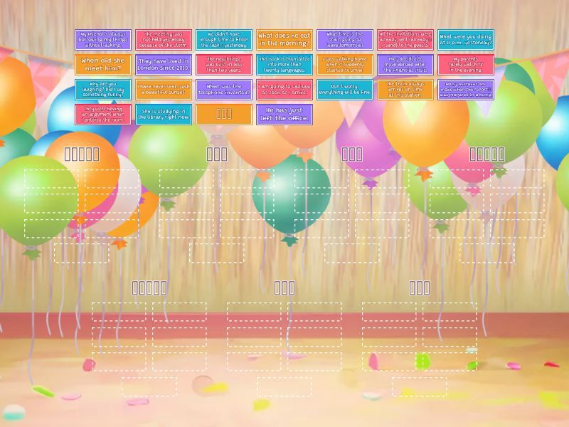 現在進行式: Why are you laughing? Did I say something funny?, My friend is always borrowing my things without asking., She is studying in the library right now., 過去式: We didn’t have enough time to finish the task任務 yesterday., When did she meet him?, They decided to move abroad after the financial crisis., 現在式: My parents rarely watch TV in the evening., The train always arrives on time at this station., What does he eat in the morning?, 現在完成式: I have never seen such a beautiful sunset., He has just left the office., They have lived in London since 2010., 過去進行式: What were you doing at 8 p.m. yesterday?, They were having an argument when I entered the room., I was walking home when it suddenly started to snow., 未來式: I am going to call you as soon as I arrive., Don’t worry, everything will be fine., What time is the train going to leave tomorrow?, 被動式: 被動式, The meeting was not held yesterday because of the storm., When was the telephone invented?, This book is translated into more than twenty languages., The new bridge was built in less than two years., Many mistakes are made when the report報告 was prepared in a hurry., All the invitations were already sent (already已經 / send) to the guests.,