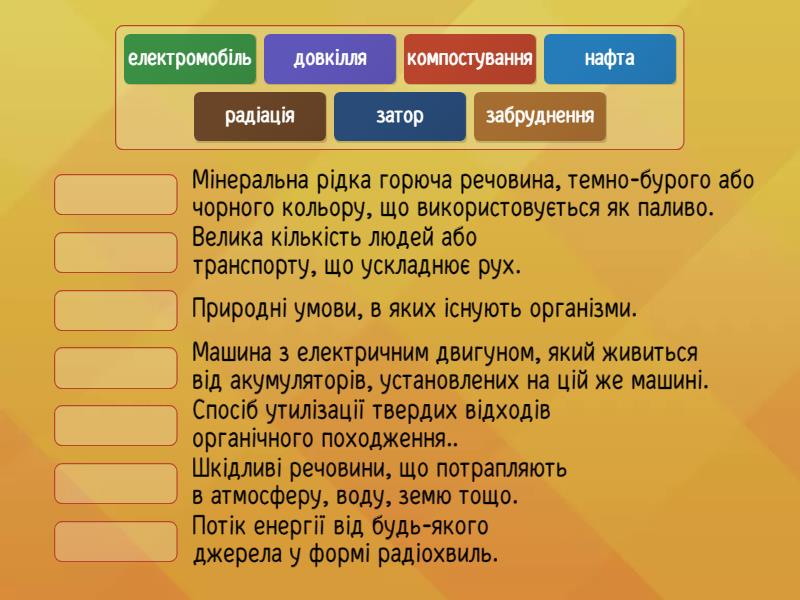 довкілля - Природні умови, в яких існують організми., нафта - Мінеральна рідка горюча речовина, темно-бурого або чорного кольору, що використовується як паливо., забруднення - Шкідливі речовини, що потрапляють в атмосферу, воду, земю тощо., компостування - Спосіб утилізації твердих відходів органічного походження.., електромобіль - Машина з електричним двигуном, який живиться від акумуляторів, установлених на цій же машині., радіація - Потік енергії від будь-якого джерела у формі радіохвиль., затор - Велика кількість людей або транспорту, що ускладнює рух.,