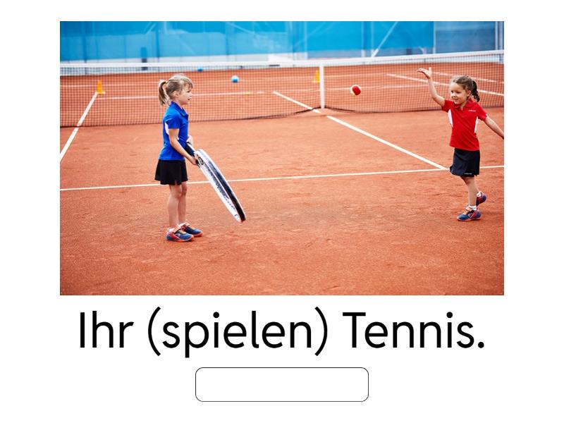 Wir (schreiben) Diktate., Sie (они) (spielen) Gitarre., Ihr (turnen) jeden Tag., Ihr (machen) gern Musik., Wir (spielen) Fußball., Sie (Вы) (kochen) einen Kuchen., Ihr (basteln) Autos., Wir (malen) Papageien., Sie (они) (spielen) Computer., Ihr (spielen) Tennis., Wir (kochen) Suppen., Sie (они) (singen) ein Lied..