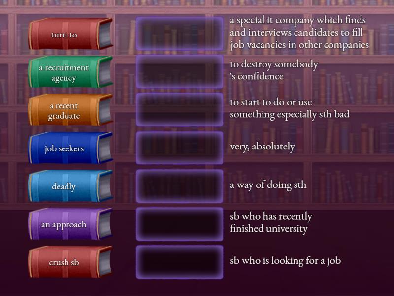 turn to - to start to do or use something especially sth bad, deadly - very, absolutely, job seekers - sb who is looking for a job, a recent graduate - sb who has recently finished university, superb - great, perfect, merely - exactly what you are saying and nothing more, an approach - a way of doing sth, a head hunter - sb who is looking for people to work for a company or an organization, a recruitment agency - a special it company which finds and interviews candidates to fill job vacancies in other companies, admit - to agree that something is true, especially unwillingly, get smth out of smth - to enjoy something or think that something is useful, crush sb - to destroy somebody 's confidence, essential - very important,