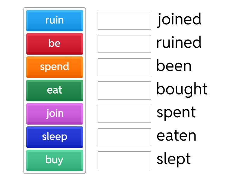 buy - bought, join - joined , sleep - slept, eat - eaten , be - been, ruin - ruined, spend - spent,