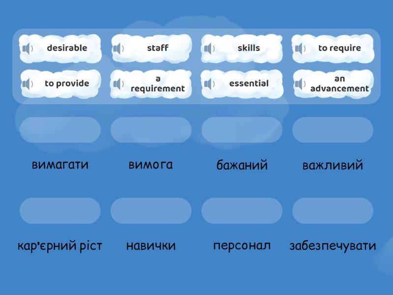 experiense - досвід, qualification - кваліфікація, quality - якість, a requirement - вимога, staff - персонал, to earn - заробляти, to provide - забезпечувати, to require - вимагати, to seek - шукати, desirable - бажаний, essential - важливий, valuable - цінний, fluent - вільно, skills - навички, a forward looking company - перспективна команда, an advancement - кар'єрний ріст ,