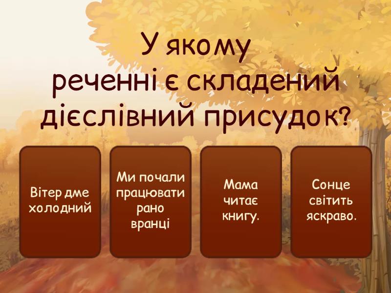 1) У якому реченні є складений дієслівний присудок? a) Вітер дме холодний b) Ми почали працювати рано вранці c) Мама читає книгу. d) Сонце світить яскраво. 2) ‎У якому реченні є складений іменний присудок? a) Діти були раді зустрічі b) Учні прибрали клас c) Собака гавкає голосно d) Ми граємо у футбол 3) Знайди речення з іменною частиною присудка: a) Дівчинка читає книжку b) На небі сяє зоря. c) Мій брат є спортсменом d) Учні вивчають тему 4) ‎Укажи речення, де присудок складений дієслівно-іменний (є і дія, і стан): a) Дощ почався. b) Ми стали дружніми c) Учитель пояснює тему d) Пташки співають радісно 5) ‎У якому реченні є складений дієслівний присудок? a) Діти граються у дворі b) Учитель пише на дошці c) Ми можемо приїхати завтра d) Сонце заходить за обрій 6) Укажи речення, де є зв’язка + іменна частина присудка: a) Вітер шумить у деревах b) Кіт сидить на вікні c) Ми малюємо малюнок d) Тато був веселий після роботи 7) ‎Познач речення зі складеним дієслівним присудком: a) Хлопчик почав співати b) Птахи літають над полем c) Вода тече в річці. d) Мама пече пиріг 8) ‎Укажи речення, де є складений іменний присудок: a) Ми збираємо яблука b) Учитель став директором c) Листя падає з дерев d) Дівчинка малює портрет 9) Знайди речення, у якому присудок виражає і дію, і стан (складений дієслівно-іменний): a) Пес спить під деревом b) Ми дивимося фільм c) Вона почала бути уважнішою d) Сестра читає вірш