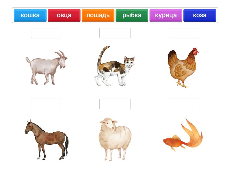 попугай, овца, коза, кошка, собака, хомяк, гусь, корова, кролик, курица, лошадь, рыбка,