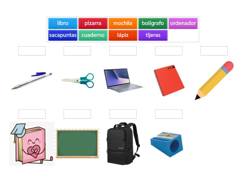 pizarra, sacapuntas, cuaderno, libro, tijeras, mochila, ordenador, bolígrafo, lápiz,