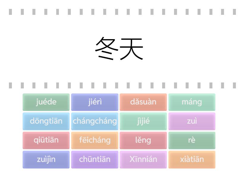 dōngtiān - 冬天, lěng - 冷, xiàtiān - 夏天, rè - 热, Xīnnián - 新年, zuìjìn - 最近, máng - 忙, dǎsuàn - 打算, chūntiān - 春天, chángcháng - 常常, qiūtiān - 秋天, fēicháng - 非常, juéde - 觉得, zuì - 最, jiérì - 节日, jìjié - 季节,