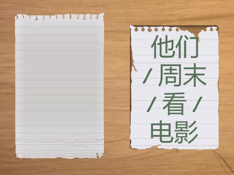 我 / 明天 / 去 / 北京, 我们 / 下午 / 去 / 图书馆, 妈妈 / 明年 / 去 / 中国, 他们 / 周末 / 看 / 电影, 季马 / 晚上 / 做 / 作业, 我 / 明天 / 吃 / 饭 / 在家, 妈妈 / 天气 / 很 / 热, 季马 / 春天 / 最 / 漂亮, 老师 / 学生 / 很 / 聪明, 她 / 电影 / 很 / 好看.