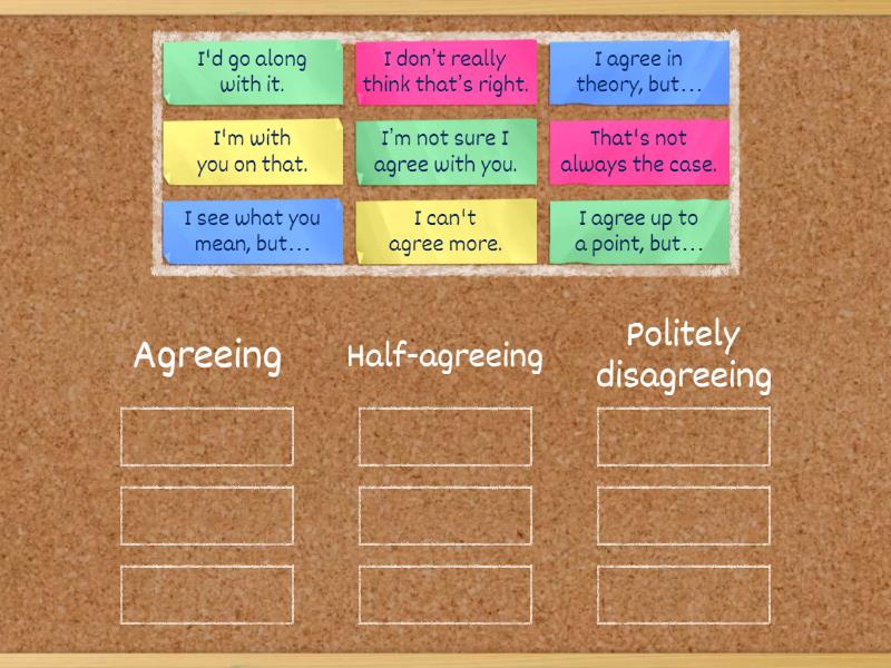 Agreeing: I can't agree more., I'd go along with it., I'm with you on that., Half-agreeing: I see what you mean, but…, I agree up to a point, but…, I agree in theory, but…, Politely disagreeing: I’m not sure I agree with you., I don’t really think that’s right., That's not always the case.,