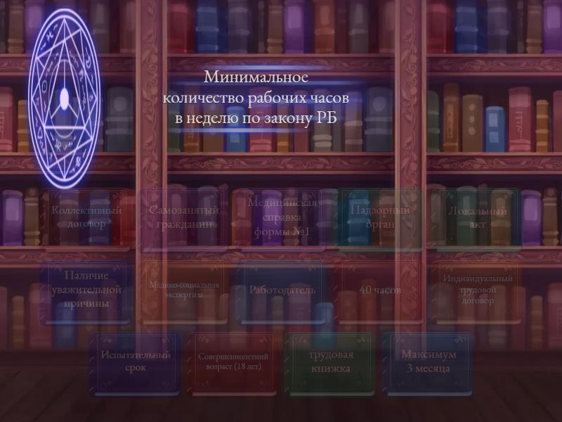 40 часов - Минимальное количество рабочих часов в неделю по закону РБ, Локальный акт - Форма документа, регламентирующего внутренние правила предприятия, Медико-социальная экспертиза - Процедура установления инвалидности работника, Наличие уважительной причины - Причина освобождения от отработки при увольнении по собственному желанию, Максимум 3 месяца - Норма продолжительности испытательного срока для руководителей организаций, Медицинская справка формы №1 - Документ, подтверждающий пригодность работника к выполнению конкретной работы, Совершеннолетний возраст (18 лет) - Возраст начала самостоятельной трудовой деятельности, трудовая книжка - Документ, подтверждающий фактический стаж работника и содержащий записи о местах работы и основаниях увольнения., Индивидуальный трудовой договор - Соглашение между двумя сторонами, Испытательный срок - Период, установленный работодателем для проверки соответствия сотрудника занимаемой должности., Работодатель - Юридическое лицо или индивидуальный предприниматель, принимающие работников на работу и несущие ответственность перед ними, Самозанятый гражданин - Лицо, которое оказывает работодателю услуги по договору оказания услуг или выполнению работ, не вступая в штат организации., Коллективный договор - Документ, подписанный коллективом работников и администрацией предприятия, регулирующий социально-экономические отношения внутри коллектива., Надзорный орган - Государственное учреждение, осуществляющее контроль соблюдения трудового законодательства и защиту прав работников.,