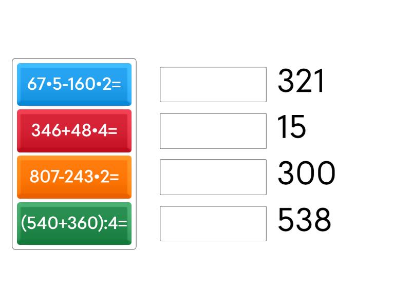 346+48•4= - 538, (540+360):4= - 300, 807-243•2= - 321, 67•5-160•2= - 15,