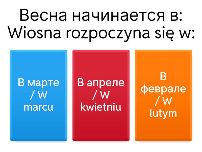 1) Весна начинается в: Wiosna rozpoczyna się w: a) В мaрте / W marcu b) В aпреле / W kwietniu c) В феврале / W lutym 2) Jakie końcowki przyjmują pory roku w rodzaju męskim (весна, лето, осень, зима)? a) весенний, летний, осенний, зимний b) весенняя, летняя, осенняя, зимняя c) весеннее, летнее, осеннее, зимнее d) весенние, летние, осенние, зимние 3) Который час? Семнадцать часов тринадцать минут. a) 17:13 b) 17:30 c) 70:13 d) 70:30 4) Przetłumacz zdanie: Это конец, товарищи! Концерта не будет. a) To już koniec, towarzysze! Koncertu nie będzie. b) To nie koniec, towarzysze! Koncertu nie będzie. c) To koniec, przyjaciele! Koncertu nie będzie. d) To koniec, wrogowie! Koncertu nie będzie. 5) Co jest 'czas' po rosyjsku? a) час b) время 6) Co jest 'pora roku' po rosyjsku? a) час года b) время года 7) Co jest "09:47" po rosyjsku? a) девять часов сорок семь минут b) девять час сорок семь минут c) девять часов сорок семь минута d) девятое час сорок семь минут 8) Как погода в Якутске зимой? a) Сильный мороз b) Холодно c) Жарко 9) Это конец, товарищи! Стенаслов (wordwall) не будет. a) Okej b) Nie okej c) Я хочу Стенаслов... :(