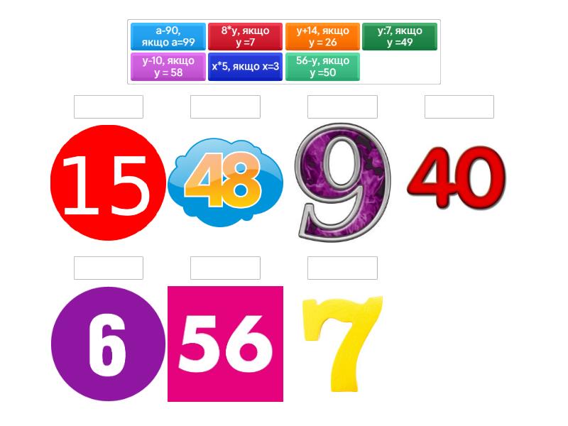 у+14, якщо у = 26, 56-у, якщо у =50, у-10, якщо у = 58, 8*у, якщо у =7, у:7, якщо у =49, х*5, якщо х=3, а-90, якщо а=99,