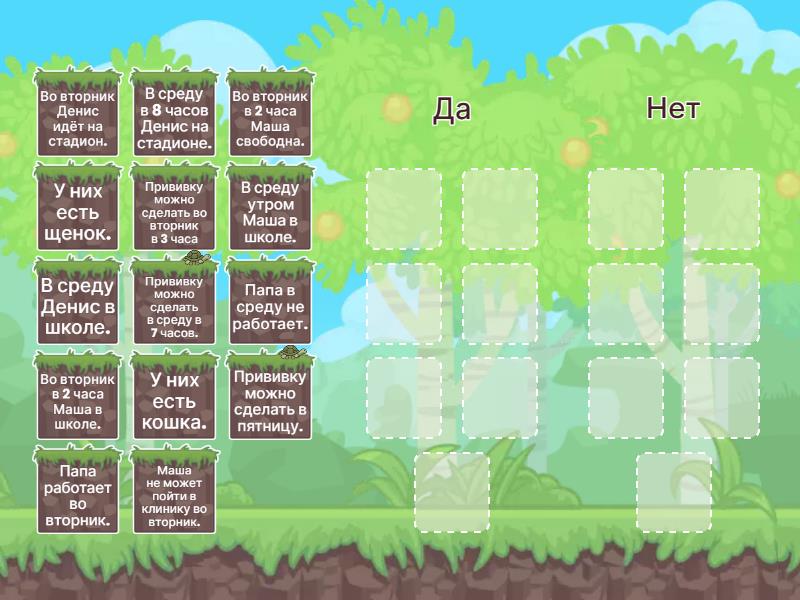 Да: У них есть щенок., Прививку можно сделать во вторник в 3 часа, Папа работает во вторник., Во вторник Денис идёт на стадион., В среду Денис в школе., В среду утром Маша в школе., Во вторник в 2 часа Маша свободна., Нет: У них есть кошка., Прививку можно сделать в пятницу., Папа в среду не работает., В среду в 8 часов Денис на стадионе., Прививку можно сделать в среду в 7 часов., Во вторник в 2 часа Маша в школе., Маша не может пойти в клинику во вторник.,