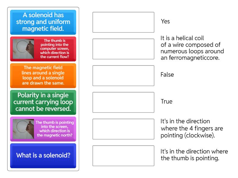 The thumb is pointing into the screen, which direction is the magnetic north? - It's in the direction where the thumb is pointing., The thumb is pointing into the computer screen, which direction is the current flow? - It's in the direction where the 4 fingers are pointing (clockwise)., What is a solenoid? - It is a helical coil of a wire composed of numerous loops around an ferromagneticcore., Polarity in a single current carrying loop cannot be reversed. - False, A solenoid has strong and uniform magnetic field. - True, The magnetic field lines around a single loop and a solenoid are drawn the same. - Yes,