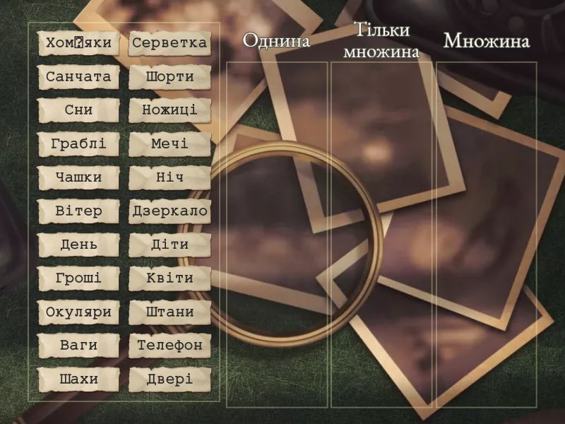 Однина: Серветка, Телефон, Дзеркало, Ніч, День, Вітер, Тільки множина: Окуляри, Штани, Ножиці, Двері, Санчата , Граблі, Шорти, Ваги, Шахи, Гроші, Множина: Квіти, Чашки, Мечі, Сни, Діти, Хомʼяки ,