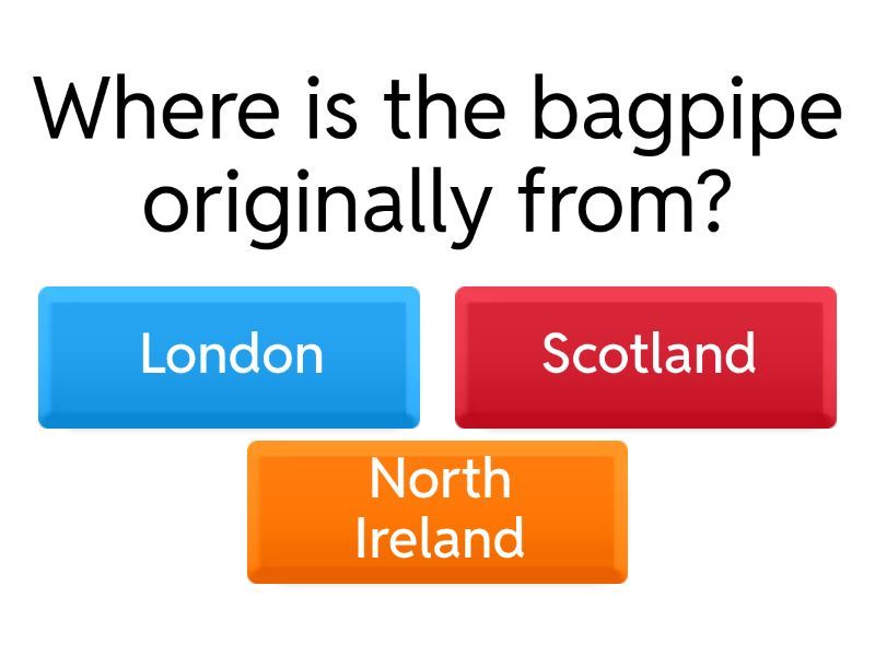 1) Where is the bagpipe originally from? a) London b) Scotland c) North Ireland 2) The London Eye is a big wheel a) yes b) no 3) Where is the bagpipe used? a) military marches b) to eat 4) The bagpipe can also be found in Romania a) yes b) no 5) When was the London Eye inaugurated? a) 2009 b) 1999 6) The London Eye is the tallest Ferris wheel in the world. a) no b) yes 7) The bagpipe is the most important musical instrument in Scotland. a) no b) yes 8) The bagpipe is made of animal skin. a) no b) yes 9) Who started the tradition of afternoon tea in England? a) Queen Victoria b) Anna,Duchess of Bedford c) Charles Dickens 10) What was the original purpose of this tradition? a) To celebrate the end of the week b) To fill the gap between lunch and dinner c) To mark the beginning of the workday 11) What foods are usually served at afternoon tea? a) pizza and soft drinks b) Tea,sandwiches,scones and cakes c) Roast meat and red wine 12) What does this tradition represent today in British culture? a) A form of entertaiment for children b) A forgotten custom c) A symbol of British elegance and hospitality