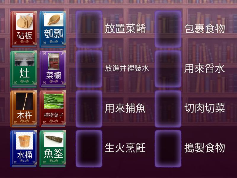 水桶 - 放進井裡裝水, 魚筌 - 用來捕魚, 菜櫥 - 放置菜餚, 木杵 - 搗製食物, 砧板 - 切肉切菜, 植物葉子 - 包裹食物, 灶 - 生火烹飪, 瓠瓢 - 用來舀水,