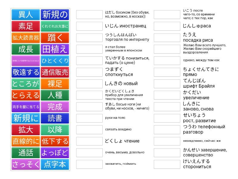 よっぽど - очень, весьма, довольно, ひとくくり - связать воедино, 人種 - じんしゅраса, 異人 - いじん иностранец, 敬遠する - けいえんする сторониться, ところが - однако, между тем как, とらえる - захватить, поймать, 田植え - たうえ посадка риса, 日本語について自信が持てるようになりました - я стал более уверенным в японском, 成長 - せいちょう рост, развитие, 完成 - かんせい завершение, совершенство, くれぐれお大事に - Желаю Вам всего лучшего, Желаю Вам скорейшего выздоровления, 読書 - どくしょ чтение, 拡大 - かくだい увеличение, 拡大読書器 - かくだいどくしょき прибор для увеличения текста при чтении, 点字本 - てんじぼん шрифт Брайля, 通信販売 - つうしんはんばい торговля по интернету, さっそく - немедленно, сейчас же, 新規の - しんきの новый, 新規に - しんきに заново, снова, 通話 - つうわ телефонный разговор, 以降 - いこう после чего-то, со времени чего; с тех пор, как, 躓く - つまずく споткнуться, 裸足 - はだし босиком (без обуви, но, возможно, в носках)), 素足 - すあし босые ноги (ни обуви, ни носков, - ничего), 両手を腰に当てる - руки на пояс, 直線的に - ちょくせんてきに прямо, 低下する - ていかする понизиться, падать (о цене),