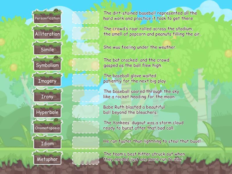 Simile - The baseball soared through the sky like a rocket heading for the moon., Metaphor - The Yankees’ dugout was a storm cloud ready to burst after that bad call., Personification - The baseball glove waited patiently for the next big play., Hyperbole - He ran faster than lightning to steal that base!, Alliteration - Babe Ruth blasted a beautiful ball beyond the bleachers., Irony - The team’s best hitter struck out when they needed just one more run to win.”, Imagery - The crowd’s roar rolled across the stadium, the smell of popcorn and peanuts filling the air., Symbolism - The dirt-stained baseball represented all the hard work and practice it took to get there, Onomatopoeia - The bat cracked, and the crowd gasped as the ball flew high., Idiom - She was feeling under the weather.,