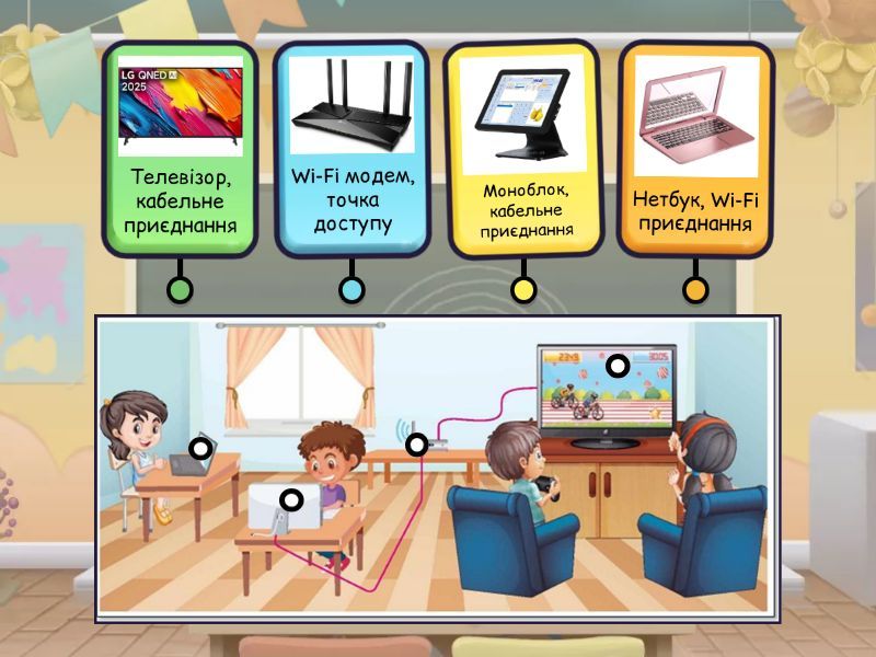 Нетбук, Wi-Fi приєднання , Моноблок, кабельне приєднання , Телевізор, кабельне приєднання, Wi-Fi модем, точка доступу.