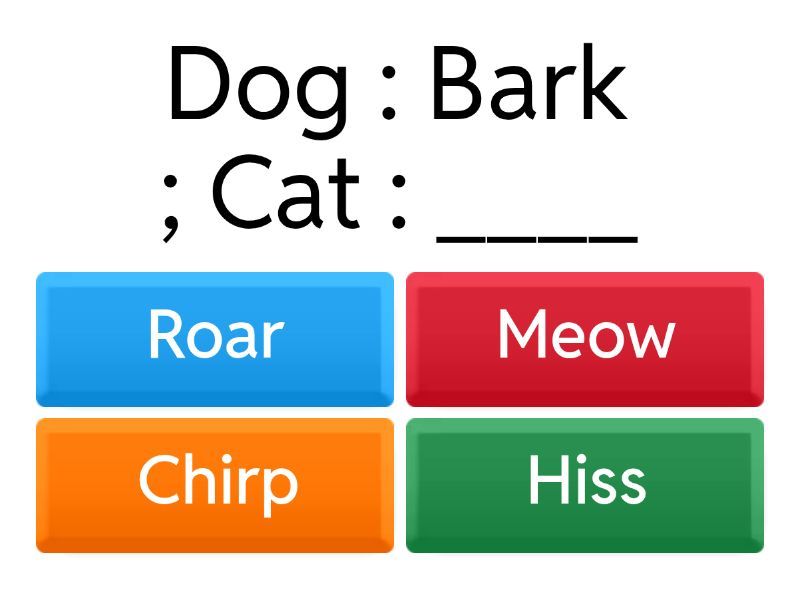 1) Dog : Bark ; Cat : ____ a) Roar b) Meow c) Chirp d) Hiss 2) Bird : Nest ; Bee : ____ a) Hive b) Web c) Den d) Burrow 3) Hot : Cold ; Day : ____ a) Sun b) Warm c) Light d) Night 4) Teacher : School ; Doctor : ____ a) Office b) Market c) Hospital d) Church 5) Puppy : Dog ; Kitten : ____ a) Cat b) Rabbit c) Goat d) Pig 6) Leaf : Tree ; Petal : ____ a) Stem b) Flower c) Root d) Seed 7) Pen : Write ; Brush : ____ a) Color b) Paint c) Draw d) Erase 8) Fish : Swim ; Bird : ____ a) Walk b) Fly c) Run d) Crawl 9) Strong : Weak ; Heavy : ____ a) Tall b) Short c) Light d) Big 10) Eye : See ; Ear : ____ a) Hear b) Smell c) Speak d) Touch 11) Fire is to Heat as Ice is to ____ a) Cold b) Snow c) Freeze d) Water 12) Rain is to Umbrella as Sun is to ____ a) Cap b) Shade c) Sunglasses d) Fan 13) Farmer is to Field as Miner is to ____ a) Farm b) Sea c) Cave d) Mine 14) Ant is to Insect as Dog is to ____ a) Reptile b) Mammal c) Amphibian d) Fish 15) Book is to Read as Song is to ____ a) Sing b) Dance c) Write d) Play 16) River is to Flow as Tree is to ____ a) Stand b) Grow c) Fall d) Drop 17) Milk is to Cow as Honey is to ____ a) Bee b) Bear c) Flower d) Sugar 18) Knife is to Cut as Eraser is to ____ a) Write b) Remove c) Erase d) Draw 19) Earthquake is to Shake as Typhoon is to ____ a) Flood b) Rain c) Wind d) Destroy 20) Kindness is to Caring as Honesty is to ____ a) Cheating b) Loyalty c) Bravery d) Truthfulness