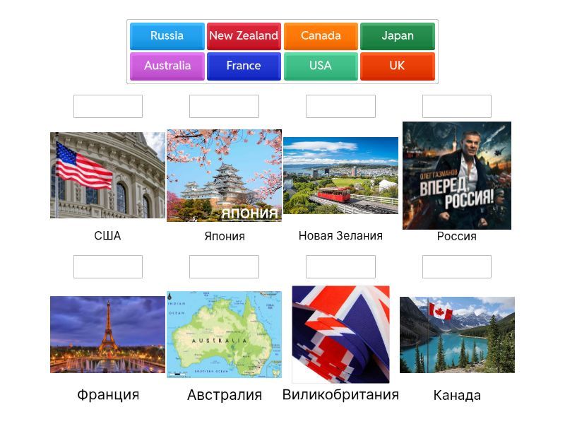 Russia - Россия, UK - Виликобритания, USA - США, Canada - Канада, Australia - Австралия, New Zealand - Новая Зелания, France - Франция, Japan - Япония,
