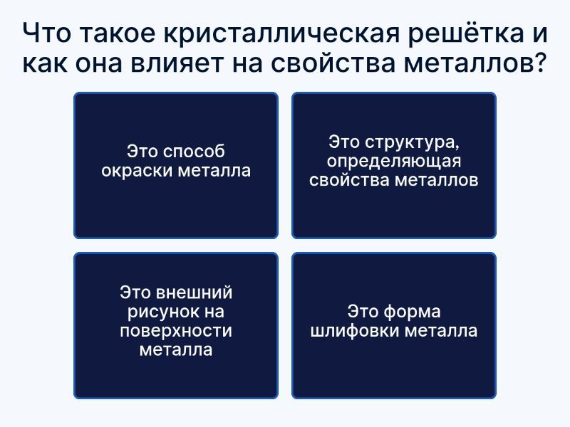 1) Что такое кристаллическая решётка и как она влияет на свойства металлов? a) Это способ окраски металла b) Это структура, определяющая свойства металлов c) Это внешний рисунок на поверхности металла d) Это форма шлифовки металла 2) Какая разница между термообработкой и закалкой металлов? a) Термообработка — это полировка металла b) Термообработка — это общий процесс, а закалка — его вид c) Закалка — это охлаждение водой после покраски d) Термообработка применяется только к дереву 3) Какие существуют основные виды коррозии? a) Электрохимическая, химическая, атмосферная b) Цветная, структурная, вязкая 4) Что такое сплав и зачем сплавляют металлы? a) Это ржавчина, образованная из нескольких металлов b) Это охлаждённый чистый металл c) Это металл, покрытый лаком d) Это комбинация металлов для улучшения свойств 5) В чём разница между пластичностью и твёрдостью? a) Пластичность — способность деформироваться, твёрдость — сопротивление проникновению b) Пластичность — это способность к изгибу, твёрдость — к деформации 6) Какие материалы используют в качестве теплоизоляции? a) Бетон, кирпич b) Сталь, алюминий c) Минеральная вата, пенополистирол d) Медь, бронза 7) Какие виды труб используются в сантехнике? a) Металлические и пластиковые b) Резиновые и тканевые c) Стеклянные и бетонные d) Картонные и деревянные 8) Для чего нужен сифон? a) Для предотвращения запахов из канализации b) Для фильтрации воды c) Для повышения давления в трубе d) Для нагрева воды 9) Что делает обратный клапан? a) Добавляет воздух в систему b) Останавливает подачу воды полностью c) Пропускает воду только в одном направлении d) Измеряет температуру воды 10) Как работает система горячего водоснабжения в доме? a) Вода поступает напрямую из канализации b) Через бойлер или тепловой пункт подаётся в трубы c) Вода нагревается в раковине d) Греется на крыше в бочках 11) Как можно соединять пластиковые трубы? a) Только с помощью гвоздей b) Склеиванием или сваркой, с фитингами c) Только приваркой к металлическим трубам d) Молотком и отверткой 12) Зачем нужен уклон в канализационной трубе? a) Чтобы вода не скапливалась на одном месте b) Чтобы труба не упиралась в пол c) Для красоты установки d) Для увеличения давления воды