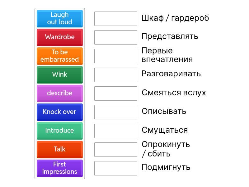 First impressions  - Первые впечатления, Beard - Борода, Laugh out loud - Смеяться вслух, Leave  - Уходить / покидать, to be worried  - Волноваться, Wink  - Подмигнуть, describe  - Описывать, Talk  - Разговаривать, Wardrobe  - Шкаф / гардероб, arrive  - Прибывать / приезжать, move  - Двигаться / переезжать, To be embarrassed  - Смущаться, Doesn’t matter  - Не имеет значения / всё равно, Earn  - Зарабатывать, Knock over  - Опрокинуть / сбить, Definitely  - Определённо / точно, Introduce - Представлять,