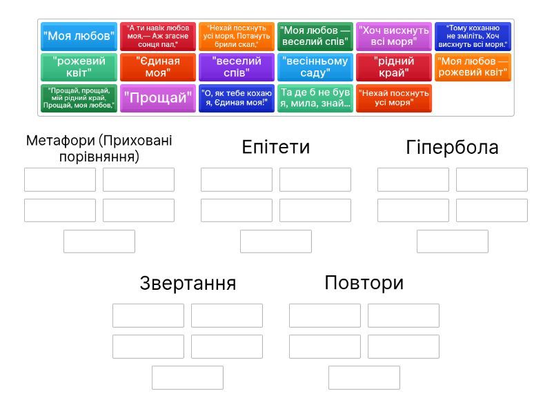 Метафори (Приховані порівняння): "Моя любов — рожевий квіт", "Моя любов — веселий спів", Епітети: "рожевий квіт", "весінньому саду", "веселий спів", "Єдиная моя", "рідний край", Гіпербола: "Тому коханню не зміліть, Хоч висхнуть всі моря.", "Нехай посхнуть усі моря, Потануть брили скал,", "А ти навік любов моя,— Аж згасне сонця пал,", Звертання: "О, як тебе кохаю я, Єдиная моя!", "Прощай, прощай, мій рідний край, Прощай, моя любов,", Та де б не був я, мила, знай..., Повтори: "Моя любов", "Прощай", "Нехай посхнуть усі моря", "Хоч висхнуть всі моря",