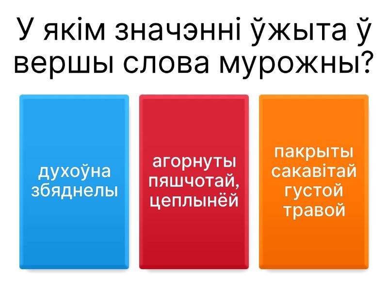 1) У якім значэнні ўжыта ў вершы слова мурожны? a) духоўна збяднелы b) агорнуты пяшчотай, цеплынёй c) пакрыты сакавітай густой травой 2) З чым параўноўваецца роднай мова ў вершы? a) са звонам b) з небам c) з сонцам 3) У адным з гэтых урыўкаў адлюстравана замілаванне аўтара выразнасцю і прыгажосцю роднай мовы a) І калі ты мяне толькі паклікаеш, памру за цябе без енку b) Мова! Як сонца маё беларускае, ты свацішся словам кожным. c) Нашу я любоў да цябе вялікую у сэрцы сваім маленькім 4) Што можна сказаць пра прыведзеныя ніжэй радкі? Цябе і заворвалі, і закопвалі, і ўсё ж нашы продкі праз гора данеслі да нас цябе, родную, цёплую, жывую і непаўторную a) сцвярджаюць, што беларуская мова - самая мілагучная ў свеце b) гэта разважанне аўтара пра няпросты лёс роднай мовы на працягу шматгадовай гісторыі беларускага народа  c) запэўніваюць, што без роднай мовы немагчыма пражыць кожнаму чалавеку, які лічыць сябе беларусам 5) Якое значэнне мае ўжытае ў вершы слова енк? a) працяглы, жаласны стогн, выкліканы болем або вялікім горам b) сум, маркота, туга c) радасць, вялікае задавальненне 6) Які прыметнік Я.Янішчыц выкарыстоўвае ў вершы для характарыстыкі слова сэрца? a) вялікае b) маленькае c) добрае 7) Чыя жаўруковая музыка чуецца "ў скошаных травах мурожных"? a) крыніцы b) зямлі c) мовы 8) Верш прымушае задумацца пра: a) свае адносіны да роднай мовы b) значэнне і ролю роднай мовы ў жыцці кожнага чалавека c) гісторыю станаўлення і развіцця беларускай мовы 9) Нашы продкі, па словах Я.Янішчыц данеслі да нас мову: a) у якой словы "звіняць сардэчнаю струною" b) вытканую " з калосся цяжкога жытоў і пшаніц" c) "родную, цёплую, жывую і непаўторную"